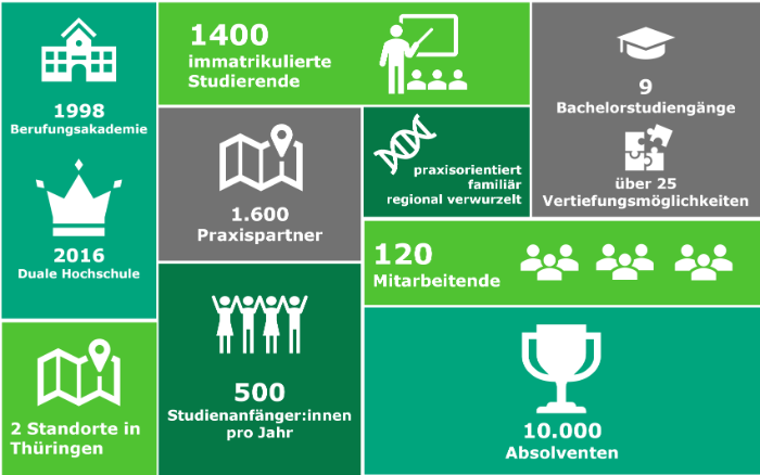 Die Duale Hochschule Gera-Eisenach blickt auf eine lange Tradition praxisnaher akademischer Ausbildung zurück. Hervorgegangen aus der Berufsakademie Thüringen wurde sie im Jahr 2016 in eine staatliche Hochschule umgewandelt. Diese Entwicklung steht für Kontinuität ebenso wie für Aufbruch: das bewährte duale Studienmodell wurde fortgeführt und durch moderne Hochschulstrukturen sowie Forschung und Transfer ergänzt. Bis heute prägt dieser Ursprung unsere Identität – praxisorientiert, regional verankert und zukunftsgerichtet.